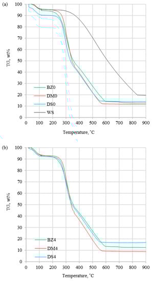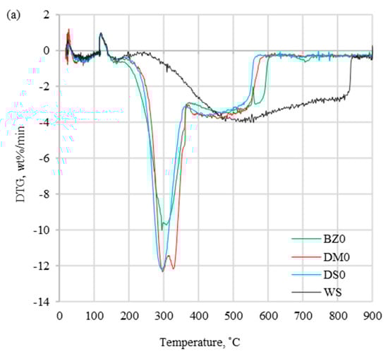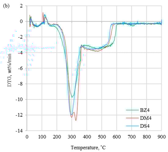- The DTG profiles obtained at 20 °C/min showed differences between coal and biomass, which were caused by a high content of cellulose, hemicellulose, and lignin in biomass samples. Additionally, coal treatment resulted in a smaller peak compared to biomass, which was a consequence of devolatilization, which progressed more slowly. The TG results informed about the general weight loss, which was significantly lower for coal than for biomass samples without additive (DM0 > BZ0 > DS0 > WS). A similar trend was observed for biomass samples with halloysite (DM4 > BZ4 > DS4).