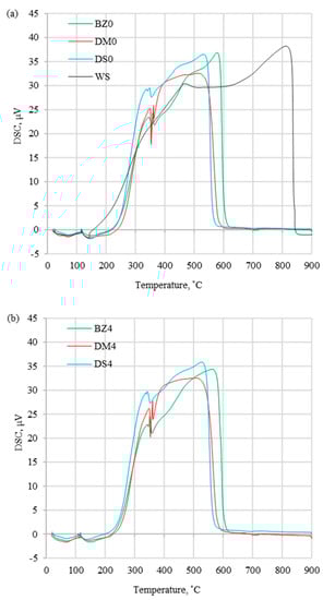 DTG and DSC curves obtained at different heating rates (5, 10, 15, 20 °C/min) for the selected fuels (WS, DS0, and DS4) are presented in Figure 5 and Figure 6. These profiles were in agreement with those found by Murredu et al. [16] during the combustion of coal and biomass samples under atmospheric air, which were obtained at different heating rates. The maximum value of the DTG curves increased with the increase of the sample heating rate, which influenced the higher value of the peak temperatures. Additionally, the percent rate of mass loss rose, and the heat transfer to the sample was uniform in experiments with a lower heating rate. In the case of coal, the DTGmax parameter was in the range of 2.8–4.5 wt%/min, whereas for biomass with and without halloysite, it was in the range of 2.8–12.7 wt%/min. As shown in Table 3, the maximum peak temperatures (Tp) of the coal sample were in the range of 443.6–535.2 °C, which was significantly higher than for biomass samples without additive (275.5–327.6 °C). This indicated that the maximum reaction rate of biomass samples occurred at lower temperatures compared to coal samples. The addition of halloysite slightly increased the above-mentioned parameters (by 1.6–4.1 °C). The ignition temperatures followed the same trend as the maximum peak temperatures, resulting in higher values for coal tests (range 354.2–373.2 °C) and indicating the lower reactivity compared to biomass. This may have been caused by a higher content of inorganic matter in the fuel (described as ash in Table 2), which possibly had an influence on heat transfer in the test chamber. The influence of ash content on the Ti could be observed by comparing the DM0 and the DM4 results, where the ignition temperature increased (by 2.4–7.0 °C) while the ash content increased (by 4 wt%) with the addition of halloysite. Compared to coal, biomass fuels had a lower content of carbon and a higher content of oxygen (Table 2), which resulted in different bonding energies and caused the earlier sample ignition. The burnout temperatures were dependent on the ignition temperatures, as the burnout process was initiated by the ignition process. Lower burnout temperatures (453.8–641.8 °C) for all tested biomass samples were the outcome of a reduced presence of burnout compounds compared to coal tests (528.4–822.1 °C). The consequence of varied burnout temperatures was the difficulty of burning samples, which caused a longer combustion time and a higher burnout temperature to complete the thermal conversion process.