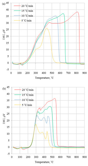 Additionally, thermogravimetric analysis should be employed at a relatively low heating rate (<20 °C/min) because the actual temperature of the fuel sample may vary from the measured temperature of the fuel sample at higher heating rates (>20 °C /min) [1,2,3,4,5]. However, to show the most accurate kinetic results, tests should be conducted for several (four to five) relatively low heating rates (<8) and with a ratio of lowest to highest heating rate greater than 10 [41,42]. Such a research procedure will not lead to unexpected ignition and uncontrolled combustion of the sample.