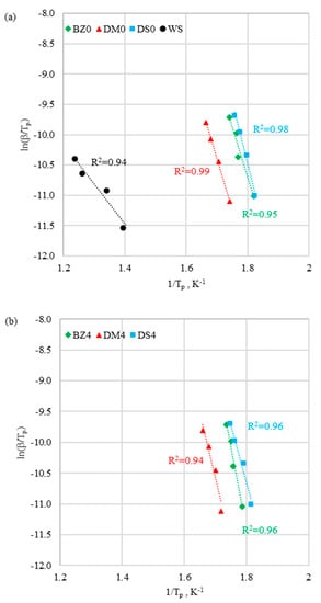 This method allowed us to obtain the value of activation energy Ea from a plot of ln(β/Tp) against 1/Tp for a series of experiments at different heating rates β and where Tp was the peak temperature for the maximum reaction rate on the DTG curve. The activation energy Ea was obtained from the slope of the Kissinger plot [2,3,4,30,31].