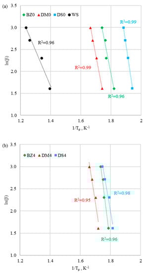 To obtain the Ozawa plot, it was necessary to run several DTG experiments with different heating rates, observe the maximum reaction rate, and determine the peak temperature for each DTG curve. The value of activation energy Ea could be obtained from a plot ln(β) against 1/Tp. The activation energy Ea was determined from the slope of the Ozawa plot [30,31,32,33].