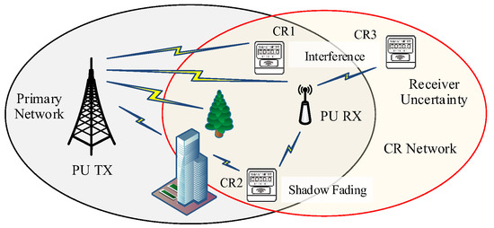 Principally, non-cooperative spectrum sensing techniques are widely considered where the PU’s state is identified by an SU individually. In practice, there are several issues that degrade the spectrum sensing performance including the low quality of PU’s signal due to low signal-to-noise ratio (SNR) [11,12,13,14], noise uncertainty [14,15], and shadowing effect [16,17]. Low SNR and noise uncertainty issues can be addressed by modifying the non-cooperative spectrum sensing techniques [18,19,20,21,22,23,24,25,26,27,28,29,30,31,32,33,34]. Energy detection [19,20,21] is the simplest non-cooperative technique which compares the detected signal energy to the predetermined threshold in order to identify the PU’s state. However, this simple technique gives an inefficient spectrum sensing performance under low SNR and noise uncertainty issues. The covariance-based spectrum sensing [22] was proposed to address the noise uncertainty issue. However, it comes at a cost of high computational burden and long sensing time. Then, a number of solutions of ED were proposed to address these issues, e.g., adaptive schemes for energy detection [23,24,25], two-stage spectrum sensing [26], multi-slot techniques [27], spectrum sensing based eigen-decomposition [28,29] and learning based spectrum sensing [30,31,32,33,34]. However, these techniques still identify the PU’s state individually and cannot address the issues of shadowing.
