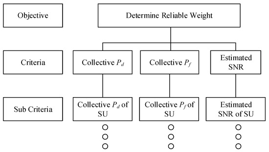 In this subsection, the reliability weight calculation is described in detail together with the mathematical models. To determine the reliability weight, the AHP method with three vital performance of SU—collective detection rate, collective false detection rate and estimated SNR of detected signal—is determined.