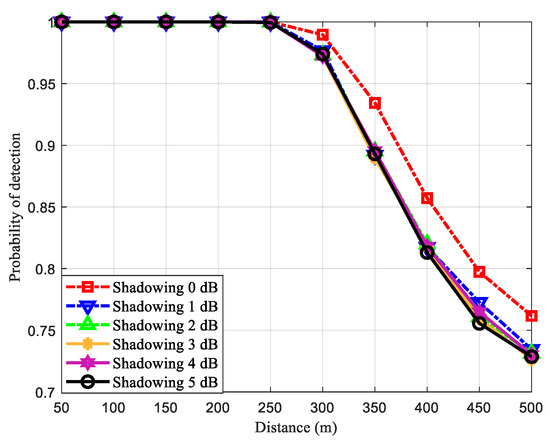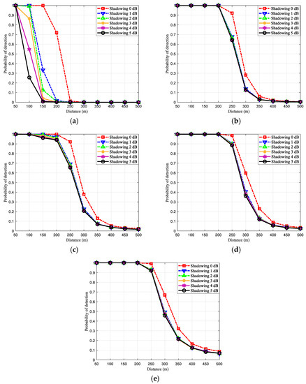 On the other hand, the other principle cooperative spectrum sensing technique, the AND rule, presents low when PU does not actually exist. However, due to its detection strategy, the detection performance of the AND rule suffers from low SNR due to path loss and shadowing effect as shown in Figure 5a. It can be seen that the AND rule achieves spectrum sensing requirement at shadowing 0 dB when the distance is lower than 150 m. Moreover, it achieves the requirement at a lower distance when the shadowing strength increases. Since a PU detection from the two principal strategies, OR and AND rule, cannot achieve the sensing performance on both metrics ( and ), the majority rule is encouraged to be used as the cooperative spectrum sensing. As shown in Figure 5b, the detection performance of the majority rule can achieve the spectrum sensing requirement when the distance is lower than 250 m.