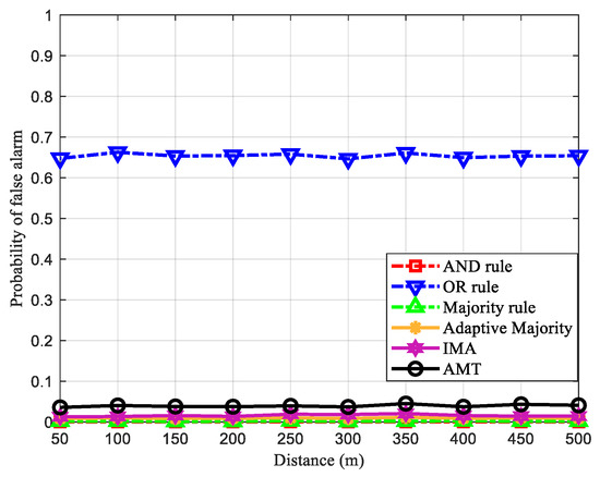 In this section, we simulate the performance of five cooperative spectrum sensing techniques—AND, OR, majority rule, improved weight algorithm (IMA) and adaptive majority rule—as compared to the proposed technique—adaptive multicriteria thresholding algorithm (AMT) under shadowing effect. The energy detection is considered as the local spectrum sensing of each unlicensed user (SU). The simulated network consists of 1 licensed user (PU) and 10 SUs (). To evaluate the performance under shadowing effect, 25% of SUs are encountered by the shadowing where the strength is set to be 0 to 5 dB. The PU signal, wireless microphone, is contaminated by additive white Gaussian noise (AWGN) [53], where the noise power is set to be −96 dBm as stated in [54,55] and the signal-to-noise ratio (SNR) decreases on the path loss effect [12,13,14]. Then, the distance between PU and SUs is ranged from 10 to 500 meters (m). Then, the SNR of wireless microphone signal decreases to −23.46 dB at 500 m. To evaluate the effect of SU’s reliability, the distance of each SU is different from others in the range of 25% randomly.