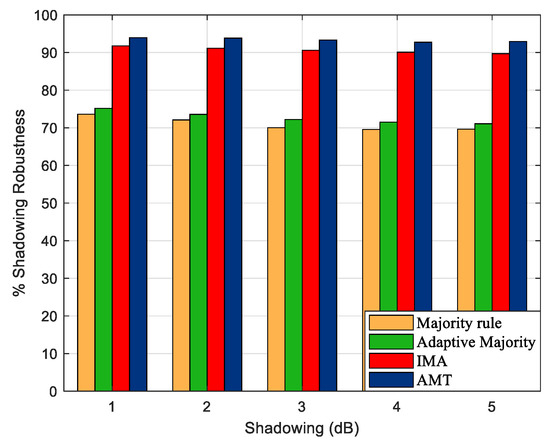 Then, we compare the robustness to shadowing effect through the proposed factor which is given in (27). As depicted in Figure 6, at 250 m, AMT presents the highest percentage of shadowing robustness for all strengths of shadowing effect. It can be noticed that the AMT and IMA algorithms present a percentage of shadowing robustness higher than 90% for all shadowing strengths since the optimal number of SUs is considered. On the other hand, by taking only reliability through only detection performance of local SU, the adaptive majority rule cannot satisfy the cooperative spectrum sensing as AMT and IMA algorithm.