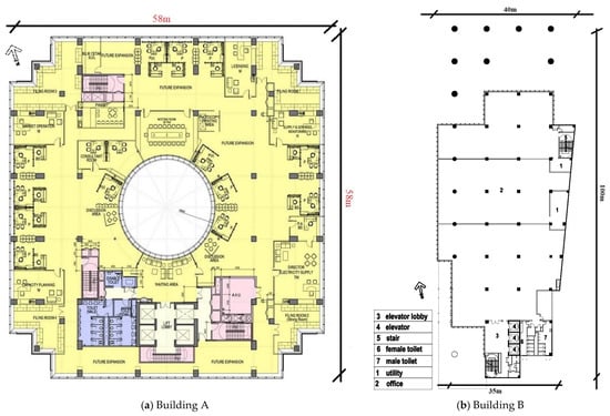 Building A has an 11,473 m2 net floor area and 14,230 m2 gross floor area, with 75% floor efficiency (Figure 1a). Building B includes a 14,087 m2 net floor area and 33,798 m2 gross floor area (Figure 1b). Buildings A and B accommodate up to 400 and 250 occupants, respectively. For building A, a combination of a radiant cooling system with pipes embedded in the concrete slabs and an air handling unit (AHU) with fans has been employed to provide thermal comfort. Building B maintains thermal comfort with an underfloor air distribution (UFAD) system. Raising the floor to provide ventilation and distributing conditioned air through vents or diffusers into the indoor environment is known as UFAD. Both buildings have utilised a centralised ventilation system, with no occupant control over temperature or air velocity. In a tropical climate, thermal comfort significantly impacts occupants’ satisfaction, thus, due to the centralised system, buildings should be investigated as one unit [14,49,50]. The facade of both buildings is mainly constructed by a glass curtain without any operable window for occupants.