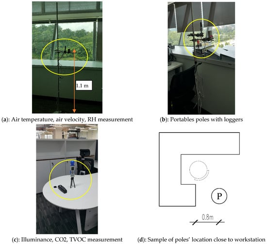 The environmental loggers attached to portable poles (Figure 2a,b) in the height of 1.1 m above the finished floor (level of sedentary activities), as suggested by ISO 16000-1 [58], close to occupants, 0.3 m. For the horizontal distribution of measurements, the devices were positioned approximately 0.8 m away from the devices and walls (Figure 2d) to avoid radiative temperature. This permitted simulation exposure of occupants to indoor air near the breathing zone when seated. Furthermore, portable light meters were placed on the working desk of the occupants to measure the lighting level (Figure 2c). This was to record a realistic approximation of the illumination received by occupants. A daily average of each parameter (121 data points) was generated for the period of measurement to present buildings’ indoor environment conditions.
