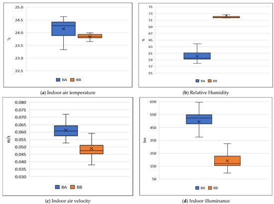 Distribution of IEQ parameters for building A (BA) and building B (BB).