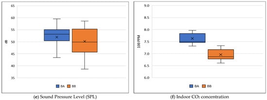 Regarding background noise from outdoors, buildings were located near the street. Additionally, the neighbourhood buildings and transportation density are observed to be lower for building B. However, the study buildings are fully air-conditioned with no operable windows, which significantly reduces noise penetration. SPL is similar for both buildings and ranges from 43.45 to 59.55 dB, with a mean of 51.9 dB, and 38.65 to 58.65, with a mean of 50.2 dB, for buildings A and B, respectively (Figure 3e). Mui and Wong [64] reported that the neutral SPL for aural comfort in typical air-conditioned offices should be between 45 and 70 dB, with a mean of 57.5 dB. Mean CO2 was detected to be 763 and 695 ppm for buildings A and B, respectively (Figure 3f). CO2 lower than 1000 ppm is considered harmless [65]. No vestige of TVOC was detected in both buildings, with 0 ppm measured.