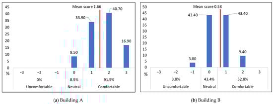 Satisfaction from overall thermal comfort is measured using a seven-point scale from uncomfortable to comfortable. This gives an overview of the portion of the occupants satisfied with thermal comfort. The finding indicated that 88.1% of respondents reported overall thermal comfort for building A, but 22.6% of respondents reported overall thermal comfort for building B. There is no thermal comfort dissatisfaction report of building A, whereas 24.5% of thermal comfort dissatisfaction was observed for building B (Figure 5a). ASHRAE Standard 55 [66] suggests a minimum of 80% satisfaction for acceptable thermal comfort, in which building B fails to meet the condition.