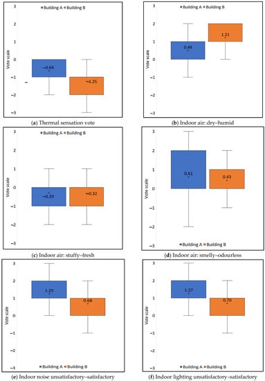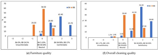 Responses to the overall air quality could be triggered by factors such as air velocity, humidity, temperature, and indoor pollutants [67,68]. Regarding the air quality, 83.1% and 60.4% of occupants reported comfort for buildings A and B, respectively. Only a minority of occupants (3.8%) of building B reported dissatisfaction from IAQ (Figure 5b). The high relative humidity level (mean of 72.4% RH) of building B is observed to be the major reason for less satisfied occupants of building B in comparison to building A. The overall noise satisfaction for buildings A and B is observed at 78% and 54.7% and minority dissatisfaction at 8.5% and 5.5%, respectively (Figure 5c). For overall lighting quality, 78% and 58.5% of occupants reported satisfaction for buildings A and B, respectively. A minority of occupants, 6.8% (building A) and 4.7% (building B), reported dissatisfaction with overall lighting quality (Figure 5d). Although the mean indoor environment illuminance level in building B was measured to be low (190.88 lux), the application of task lighting increased the occupants’ satisfaction for overall lighting. Another significant factor of indoor environment quality is furniture, which contributes to the occupants’ overall IEQ comfort. Furniture for buildings A and B were reported to be 94.90% and 17% comfortable, respectively. However, 24.5% reported uncomfortable furniture for building B (Figure 5e). The cleanliness satisfaction of buildings A and B were reported as 94.90% and 58.50%, respectively. Dissatisfaction from cleanliness was reported as being minor, as 1.7% and 1.9% for buildings A and B, respectively (Figure 5f). Generally, most occupants reported satisfaction for the overall quality of parameters, which is aligned with the overall comfort. However, it should be noted that a significant group of occupants reported neutral from “overall IEQ” as well as parameters of IEQ, where any changes in the indoor environmental quality could push them to comfort, or in a worse-case scenario, to the uncomfortable range.