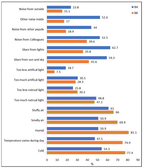 Regarding acoustic quality, both buildings have a similar result to a typical office building within a range of 45 to 70 dB. The SPL for building A was determined to be around 51.9 dB (Table 6), which resulted in occupants’ mean vote of 1.25 (equivalent to slightly satisfactory) (Figure 8e). SPL of 50.2 dB for building B comes with occupants’ mean vote of 0.7 (equivalent to slightly satisfactory). Under the noise circumstances of both buildings, lower SPL is suggested for higher satisfaction. Particularly, the reduction of noises from colleagues is critical, as it was one of the main dissatisfaction sources in this study, as well as findings from Banbury et al. [79]. Menadue et al. [80] indicated that noise satisfaction is higher in the non-Green Star office buildings compared to Green Star-certified office buildings. Also, Lee [81] indicated that acoustic quality in open-plan offices with high cubicle stations is lower than private rooms or shared rooms in LEED-certified office buildings. Passero et al. [82] suggested the use of divider panels between the cubicles/workstations and high sound-absorber materials for the roof finishing to improve the acoustic quality of the open-plan offices. Virjonen et al. [83] also indicated that SPL could be as low as 39 dB in open-plan office buildings with a robust acoustic design plan, whereas Hongisto et al. [84] implied that typical open-plan offices show an SPL range between 50 and 60 dB.