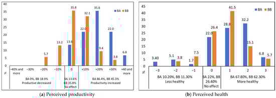 Productivity is defined as “…the ability of people to enhance their work output through increases in the quantity and/or quality of the product or service they deliver”, by Leaman et al. [69]. Since it is difficult to achieve a meaningful evaluation of the productivity or work output, a self-report of productivity evaluation is suggested, known as “perceived productivity’ [69]. Similarly, feeling healthy in the buildings has been self-reported and evaluated in the POE studies [70,71,72]. To measure perceived productivity and health, therefore, occupants were asked in the questionnaire survey to self-report IEQ impact on perceived productivity and heath. For productivity, a nine-point scale measurement was used, as productivity decreased by 1: −40% or more, 2: −30%, 3: −20%, 4: −10%, 5: 0%, and productivity increased by 6: + 10%, 7: +20%, 8: +30%, 0: +40% or more for IEQ. Also, occupants reported feeling healthier or less healthy in the questionnaire (seven-point scale, with 1 as less healthy to 7 as healthier) in the buildings to measure perceived health. The measuring scale was transformed into −4 to +4 from 1 to 9 for productivity and −3 to 3 from 1 to 7 for health. Also, votes over −4 to −1 were considered as less productive and +1 to +4 as more productive, as well as −3 to −1 as less healthy and 1 to 3 as healthier. Figure 7 demonstrates the responses’ frequency distribution for perceived productivity and health: 86.40% and 45.30% of occupants reported being more productive in buildings A and B respectively, whereas only 18.9% of respondents reported decreased productivity in building B (Figure 7a). Similar to the perceived productivity, 67.80% and 62.30% of respondents reported feeling healthier, with only a minority reporting less healthy, 10.2% and 11.30% for buildings A and B, respectively.