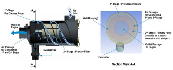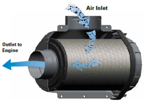 Because they are usually used for agricultural purposes or mountain activities on unpaved roads, utility terrain vehicles (UTVs) are operated in environments with a large amount of soil dust compared to vehicles traveling on paved roads. This results in relatively more soil dust being sucked into the intake system, thereby sharply reducing the air filter lifespan. Thus, instead of the one-stage air cleaner used in general passenger vehicles, which consists of a single filter as shown in Figure 1, a two-stage air cleaner is employed in UTVs that first applies a pre-cleaner stage to separate dust particles from the intake air and into an evacuator through centrifugal force, then sends the cleaned air to the primary filter, as shown in Figure 2 [1,2,3,4,5,6,7]. Thus, only a minimum amount of dust is removed in the second-stage primary filter element. The effective removal of dust is therefore critically important in realizing the desired engine performance and acceptable primary filter lifespan.