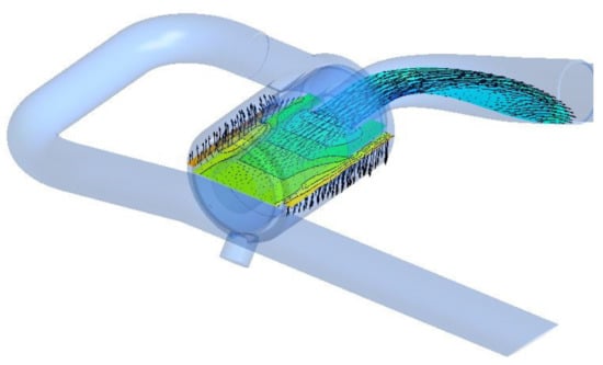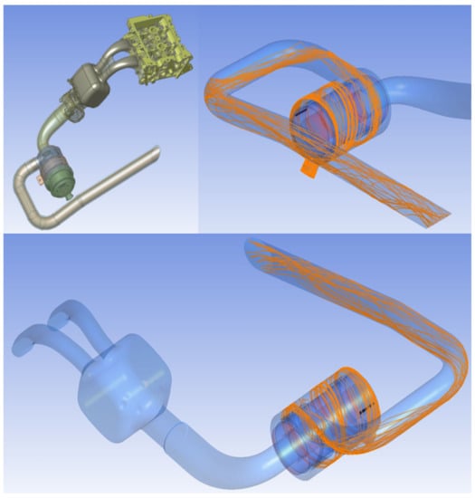 Although the purpose of this study is to optimize the shape of a two-stage air cleaner, it is very important to consider the entire intake system in the filter shape optimization process because the air cleaner is affected by the intake pipe as a part of the engine intake system [8,9,10]. For this reason, in this study, filter optimization analysis was performed by including the entire intake system as an object of flow analysis. Figure 3 shows the geometry of the engine and intake system considered in this study and the trajectories of the coarse dust particles that can be introduced through the intake system during UTV engine operation. As shown in the figure, when the first stage pre-cleaner of the air filter is effectively designed, most of the coarse dust particles will be collected in the evacuator for discharge, and only clean air is sent to the primary filter.