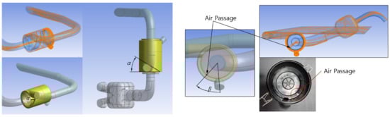 Figure 4 shows the definitions of the design variables α and β used to control the passage of air through the pre-cleaner and into the primary filter. As shown in the figure, the air containing dust particles is introduced into the air filter through the snorkel of the intake system and moves toward the end where the evacuator is located while rotating along the outer surface of the air filter at the pre-cleaner inlet. The inclination angle α shown in the figure controls the direction of the dust particles as they move forward under rotation. As can be seen from Figure 2 and Figure 4, the dust particles that are forced out of the end of the pre-cleaner drop into the evacuator, which is located below the filter, under the influence of both centrifugal force and gravity, realizing separation. Then, only the cleaned air moves from the pre-cleaner into the primary filter through the air passage connecting the two spaces. The angle β determines the location of this air passage, and is thus an important variable dictating the efficacy of dust particle separation according to the filter operating conditions (e.g., the intake air volume, which determines the flow velocity) and the properties of the dust particles (e.g., their size and weight, which are related to the applied centrifugal force).