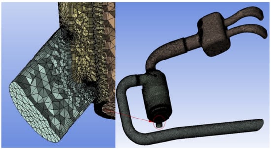 Figure 5 shows the geometric configuration and model mesh employed in the computational fluid dynamics (CFD) analysis of the air intake system conducted in this study using ANSYS CFX. Since the resolution of the mesh defining the computational domain directly affects the quality and cost of the analysis, the geometry and size of the computational mesh were determined using a mesh-independence test [12]. As a result of this test, approximately 4,100,000 meshes were used to construct the model in this study. Considering the complexity of the geometry, the inside of the air intake system was constructed with tetrahedral meshes. For the walls, four-layer inflation was inserted using prism meshes so that the y+ value could be 100 or less in order to properly consider the effect of turbulence on the calculation results [13]. Table 3 shows the boundary conditions used for the analysis. As shown in the table, an air temperature of 25 ℃ and an air pressure of 1 bar were set as inlet boundary conditions. For the outlet boundary conditions, an air mass flow of 0.0255 kg/s was applied at 4500 rpm full load condition and 0.0340 kg/s was applied at 6000 rpm full load condition. These values were provided by the engine manufacturer that produces the 0.8 L-class 2-cylinder natural aspiration gasoline engine mounted on off-road UTVs. Note that 4500 rpm is the most frequently used full load operating condition for UTVs, while operating at 6000 rpm can produce the maximum output from UTVs. The shear stress transport (SST) model recommended by CFX as being suitable for rotating flow was employed as the turbulence model in this analysis [13].