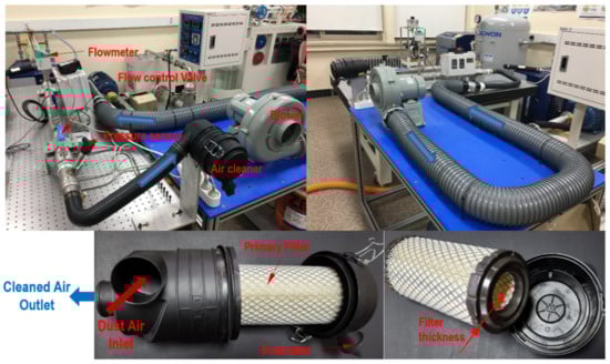 Figure 6 shows the exterior of the pre-cleaner and the primary filter element inside the two-stage air cleaner, as well as the test rig used to measure the flow resistance according to the air flow. The primary filter element, which filters the particulate matter, is generally modelled as a porous material in computational flow analyses [2,3,4,5,13]. As a result, the most important flow characteristic value in the model is the pressure drop across the primary filter element according to the air flow rate. When using ANSYS CFX, the flow resistance of the porous filter material is taken as the momentum source term () as follows [13]: