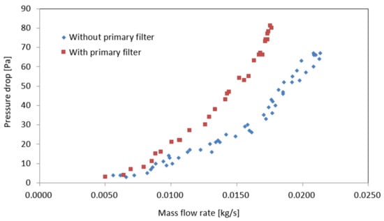 To obtain the coefficients and in Equation (1) using the experimentally obtained values, can be defined as the pressure drop () that occurs when the working fluid passes through the thickness (L) of the primary filter element, and the values of (the linear resistance coefficient) and (the quadratic resistance coefficient) are determined by transforming Equation (1) into [13]