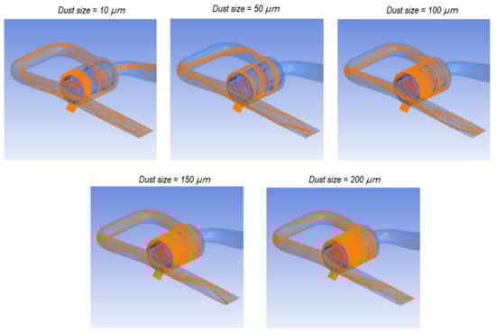 Figure 8 shows the simulated movement behaviour of dust particles sized 10, 50, 100, 150 and 200 μm in the intake system at a centrifugation speed of 4500 rpm, which is the most frequently used operating condition. To calculate the overall pre-cleaner efficiency using Equations (3) and (4), the primary filter element was modelled as a porous material, and the analysis was conducted under the condition that only flow resistance applies and the unseparated dust particles pass through the porous material. This allowed the efficiency to be easily calculated by distinguishing the dust particles caught in the evacuator located in the pre-cleaner during operation from those that exited toward the primary filter element through the air passage. As can be seen from the figure, some of the 10 μm dust particles, which are the lightest under the given operating and design conditions, were caught in the evacuator but others exited toward the primary filter element through the air passage, whereas all of the relatively heavy 50, 100 and 150 μm particles were filtered by the evacuator due to the sufficient centrifugal force. However, some of the heaviest 200 μm particles escaped through the air passage, indicating that complex correlations may occur between the operating conditions and design variables.