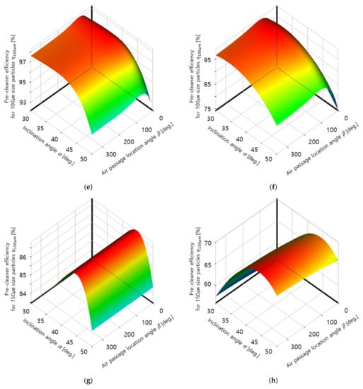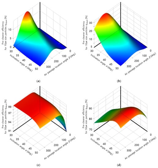 Figure 9 shows the response surfaces obtained from the results of the computational flow analysis of pre-cleaner efficiency for each dust particle size according to the values of α and β. The efficiency of 10 μm particle removal was notably lower than that of the other particles. This appears to be because these particles could not be sufficiently separated from air as they were relatively light and thus did not receive sufficient centrifugal force from the rotation of the air along the flow path inside the pre-cleaner. The case of the 10 μm particles demonstrates that the angle β exhibits a maximum efficiency at a specific value. This tendency to exhibit a discrete maximum gradually decreased as the particle size increased, and particles sized of 150 μm or larger were not affected by the β value at all. In terms of the angle α, which affects the rotational direction of the intake air, the pre-cleaner efficiency also reacted very sensitively to particle size. Overall, as the particle size increased, the α value that maximized the pre-cleaner efficiency also showed a tendency to increase.