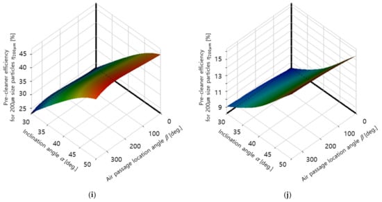 Response surface of pre-cleaner efficiency for dust particle of each size according to change of design variables α and β: (a) 4500 rpm, dust size = 10 μm; (b) 6000 rpm, dust size = 10 μm; (c) 4500 rpm, dust size = 50 μm; (d) 6000 rpm, dust size = 50 μm; (e) 4500 rpm, dust size = 100 μm; (f) 6000 rpm, dust size = 100 μm; (g) 4500 rpm, dust size = 150 μm; (h) 6000 rpm, dust size = 150 μm; (i) 4500 rpm, dust size = 200 μm; and (j) 6000 rpm, dust size = 200 μm.
