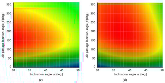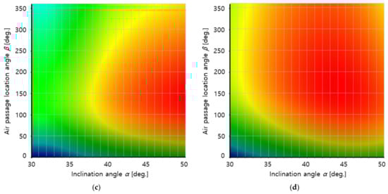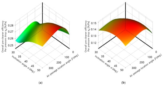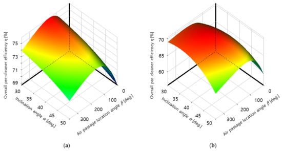 Figure 10 shows the response surfaces for the overall pre-cleaner efficiency calculated using Equation (4). When the optimal values for design variables α and β were calculated using the ANSYS Design Exploration optimization software, it was found that the pre-cleaner efficiency was maximized at α = 30° and β = 156° for 4500 rpm and at α = 37° and β = 233° for 6000 rpm.