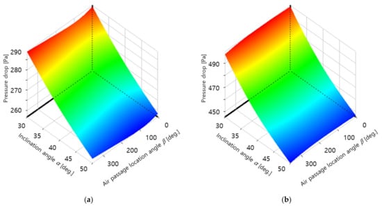 Figure 11 shows the calculated pressure drop in the intake system according to the design variables α and β, in which it can be observed that the pressure drop was not sensitive to but was very sensitive to α. This is because the frictional resistance decreased with increasing α, as the air introduced into the pre-cleaner was bent and rotated at a larger angle, thereby decreasing the number of air rotations during its movement through the pre-cleaner and thus the total travel distance of the air before escaping through the air passage.
