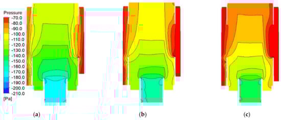 Figure 13 and Figure 14 are the results showing how the pressure drop of the air passing through the air cleaner changes as the optimization design variable α and engine speed change. Comparing the pressure contour results at the pre-cleaner stage of the air cleaner in the figure, it can be confirmed once again that the pressure drop rapidly decreases as the variable α increases. As shown by Equation (2), it can be seen by comparing the results of Figure 13 and Figure 14 that the pressure drop phenomenon in the filter becomes more severe because the flow velocity through the filter increases as the engine speed increases to 6000 rpm.