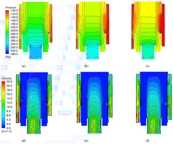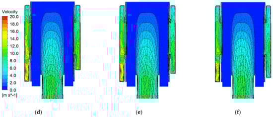 Pressure and velocity contour on plan specified Figure 12 according to change in design variable α at 6000 rpm condition: pressure contours at (a) α = 30°, (b) α = 40° and (c) α = 50°, and velocity contours at (d) α = 30°, (e) α = 40° and (f) α = 50°.