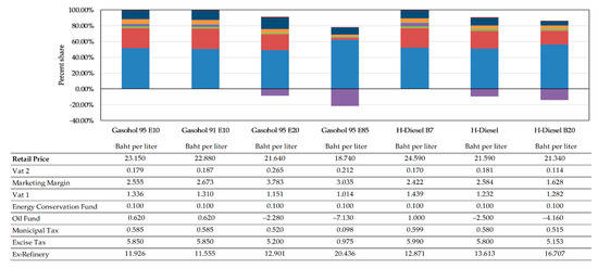 Figure 1 shows an example of the biofuel price structure of Thailand. The graph indicates that four biofuel types have been moderately subsidized. The biofuels sold in Thailand are categorized as biodiesel and gasohol. There are three types of biodiesel, namely H-Diesel (mandatory), H-Diesel B7 (option), and H-Diesel B20 (option for heavy trucks). Gasohol is classified as Gasohol 91, Gasohol 95 (E10), Gasohol 95 (E20), and Gasohol 95 (E85) [7]. Retail prices comprise ex-refinery or producer prices, excise tax, municipal tax, oil fund levy, energy conservation fund, value-added tax (VAT) on the oil producer (VAT1), marketing margins, and value-added tax on the oil trader (VAT2). The negative value of the oil fund means the fuels are subsidized, including Gasohol 95 (E20), Gasohol 95 (E85), H-Diesel, and H-Diesel B20. If the subsidy is removed, the retail prices would increase correspondingly, therefore inducing higher production costs, household expenditures, and other costs of economic activities.