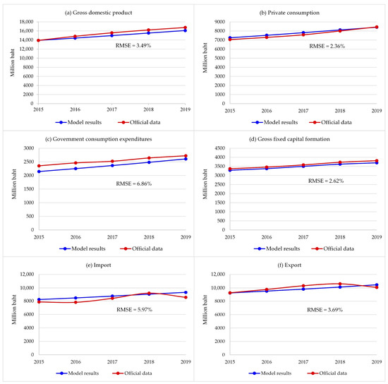 To ensure the precision of the model, the dynamic parameters were repeatedly calibrated until the percentage of root mean square error (RMSE) of the model and the official data were almost the same. Figure 4 shows the RMSE of macroeconomic indices lower than 10%. The maximum RMSE was government consumption expenditures of 6.86%, whereas the minimum RMSE was private consumption (PCON) of 2.36%. The rest of the indices, including gross domestic product (GDP), gross fixed capital formation (GFCF), import, and export, displayed RMSEs of 3.49%, 2.62%, 5.97%, and 3.69%, respectively. Consequently, the model was reliable and stable for forecasting economic variations together.