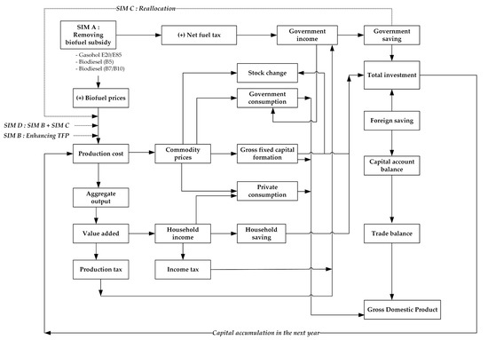 Figure 5 shows the adjustment of economic agents and firms. In SIM A, the removal of the biofuel subsidy leads to a higher fuel tax on the first path that the government would gain more income. Then, the government has an income for consumption of goods and services. The rest of the government consumption would be transferred for saving, which could be combined with the savings of a household and a foreigner to become the total investment.