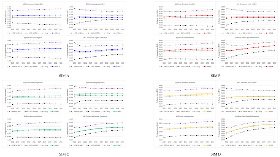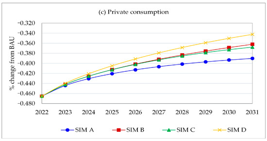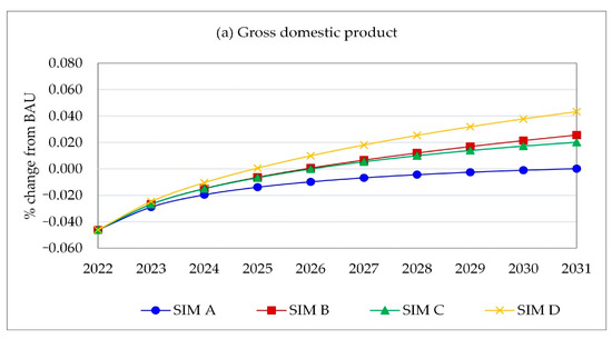 Finally, the GDP change comprises private consumption, government consumption, GFCF, stock changes, and trade balance. In SIM A, the negative impacts of the subsidy removal were similar to findings of previous studies [13,42,43,44,45,46,47].