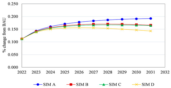 Figure 7 displays the effects of all scenarios on the CPI. In contrast to the GDP, removal of the biofuel subsidy (SIM A) would increase the CPI thoroughly during 2022–2031. Given the higher prices of biofuel, the production sectors would then suffer higher production costs. This result differs from a previous study [18] that reported removal of the oil fund would lead to a decline in the CPI. In this study, at the top level of the production function, as mentioned in Section 3.2, the substitution between primary input and intermediate commodities is assumed to be fixed, and there is no replacement by each other. In addition, mandate and optional biodiesel are subsidized. As a result, there is no choice for people or industry uses, i.e., They must assume there would be higher prices of biodiesel. Unlike gasohol, currently, only gasohol E20 and E85 are still being subsidized. If the subsidies on gasohol E20 and E85 are eliminated, both fuel prices would increase automatically. Instead of using gasohol E20 and E85, people could also switch to use gasohol E10. In reality, biodiesel is a crucial fuel for the transportation and industry sectors. Hence, increasing biodiesel prices caused by terminating subsidies significantly affects the economy.