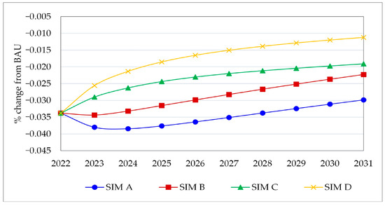 Figure 8 reveals the effects on private consumption, which are similar to the GDP results. The results show that increased biofuel prices resulting from abolishing biofuel subsidies (SIM A) would lead to a decline in the PCON over the period. Initially, the removal of biofuel subsidies would affect the higher production costs and lower outputs and would also lead to lower value added along with a household income reduction. Given the decrease in household income, people must reduce their consumption; therefore, the household would adjust consumption to satisfy budget constraints. The average PCON would decrease by 0.416% (see Table 2).