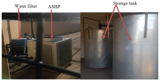 Illustration of the installed ASHP unit, water filter and the storage tanks.
