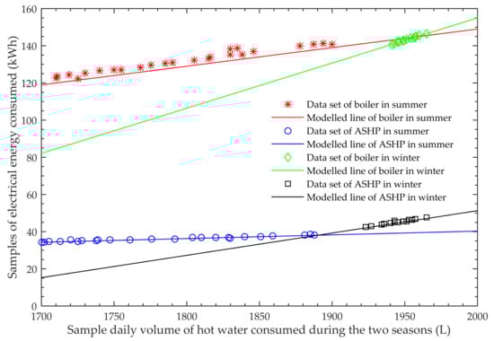 The processed data of the daily volumes of hot water and electrical energy consumed by the electric boiler and the ASHP water heater were partitioned into 70 and 30% of the trained data set and test data set, respectively. Linear regression models to correlate the volumes of daily hot water consumption to the daily electrical energy consumption by the electric boiler and the ASHP water heater were determined for both summer and winter. Figure 3 shows a sample of the daily volumes of hot water and electrical energy consumed from the two heating systems. Table 4 shows the forcing and scaling constants of the mathematical models of the daily electrical energy consumed with the volumes of hot water consumed as a predictor for the two hot water heating systems for both seasons.