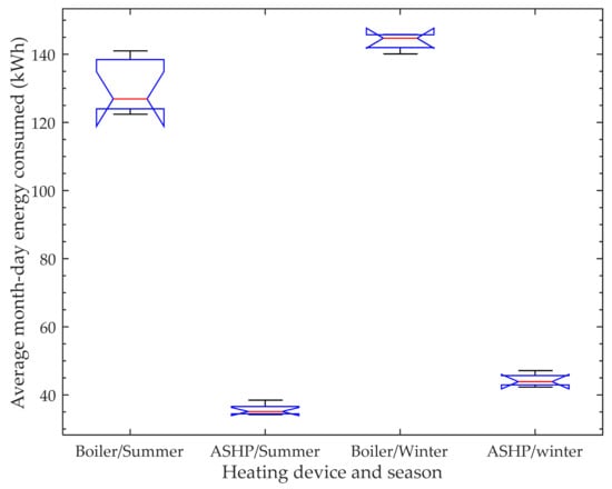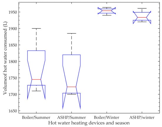 The daily consumption of the volumes of hot water and the electrical energy consumed by the electric boiler and the ASHP water heater were compared, using the Wilcoxon rank sum test for both summer and winter.