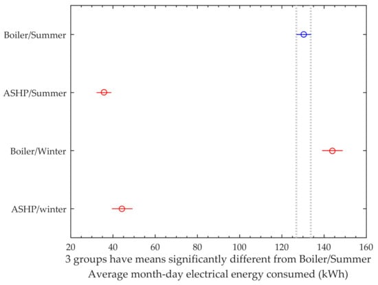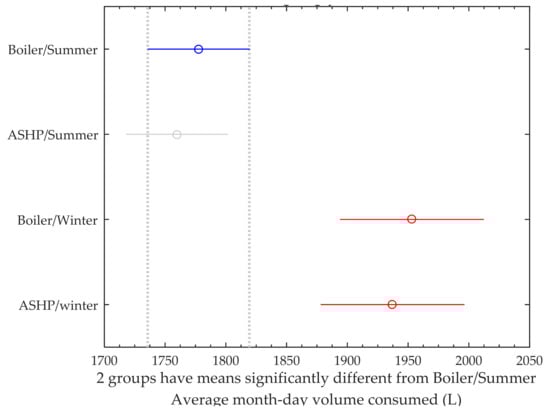 Figure 7 shows a multiple comparison interactive graph of the four group means of the average month-day volume of hot water consumed. The figure shows that two of the pairwise groups (volume consumed from the boiler and ASHP in summer and from the boiler and ASHP in winter) do overlap and therefore exhibited no significant difference. Figure 7 also showed that four of the pairwise groups (volume consumed from the boiler in summer and winter; the boiler in summer and ASHP in winter, the ASHP in summer and boiler in winter, the ASHP in summer and winter) among the four group means were disjoint. Therefore, there existed significant differences between each of the four pairwise groups.