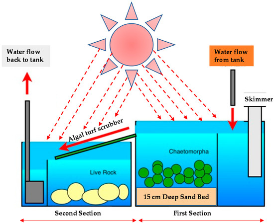An ATS is a modified cultivation system, which was firstly introduced in the early 1980s by Professor Walter Adey [76]. An ATS cultivation system provides a downward sloped surface for water or influent to flow across, in a pulsed or continuous manner as showed in Figure 3 [77], which promotes growth of macroalgae [30]. In the ATS system, microalgae grow efficacity due to appropriate uptake of inorganic compounds from wastewater and releasing dissolved oxygen (DO) through photosynthesis. ATS microalgae cultivation systems improved nutrients/pollutant removal efficiency as well as allows faster growth rate due to superior photosynthetic activities, which releases a higher amount of O2. ATS systems are also exploited for wastewater treatment or resource recovery from different type of wastewater such as an animal farm (dairy farm, aquaculture) wastewater, sewage wastewater, and industrial streams wastewater. Furthermore, an ATS cultivation system offers 5–10 times higher microalgal biomass productivities as compared to other types of land-based cultivation, but are limited due to lower handling capacity [30]. Moreover, in the ATS cultivation system, microalgae cultivation is able to grow in a continuous mode without centrifuging the biomass during production [77,78,79]. Therefore, higher biomass productivity and nutrient removal efficiency and easy biomass harvesting potentially decreases the overall cost involved in resource recovery from wastewater [80]. Moreover, enhanced growth rate and subsequently harvested biomass from an optimized ATS cultivation system could be utilized for various applications [81]. Siville and Boeing [82] reported that an ATS is more efficient for resource recovery from wastewater applying the microalgal technology. Several results indicated that ATS microalgae cultivation systems can permit the higher rate removal of nitrate from various wastewaters and produced biomass can be exploited for commercial purposes. The key advantages and disadvantages are discussed in Table 2 and compared with other cultivation approaches.