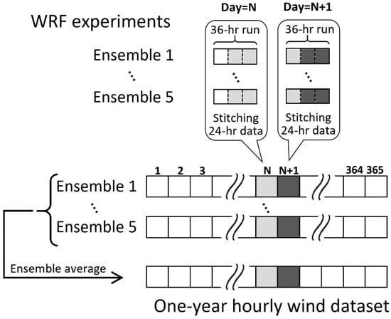 For each of the simulations, the domain indicated in Figure 1 with 150 × 150 grid points, is used. The Philippine region belongs to tropical rainforest or tropical monsoon climates. The domain is vertically divided into 40 layers whose thickness increases with height ranging from 25 m at the lowest layer to 622 m in the middle troposphere. Wind speeds are obtained at 100 to 2500-m heights above ground level with an interval of 100 m by vertical interpolation. Individual 36-h simulations are made with the first 12 h of the simulations removed (Figure 2) to account for spin-up []. The remaining 24 h are stitched together to create one-year wind speed simulations for each of the ensemble members through post-processing. In the studied area, diurnal cycle is a dominant mode of the wind variability. Hence, our main results described in Section 3 (i.e., the timing and the magnitude of wind speed change) are expected to be valid for other years.