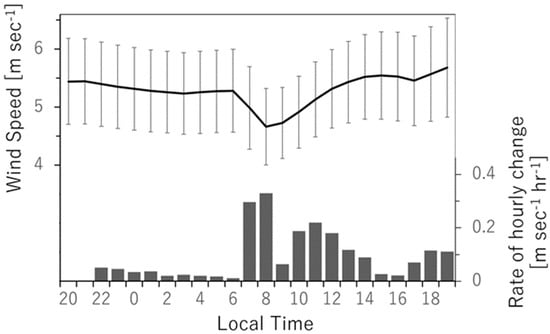 Diurnal cycle of area-averaged annual means of hourly 100m-height onshore wind speeds (black solid line) obtained from the mean of ensemble members. Error bars and black bars represent the range of standard deviation among the ensemble members and magnitude of the hourly change of the wind speed, respectively. The hourly changes are computed by the previous hour subtracted from the current hour.