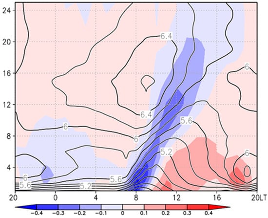 Vertical cross-sections of area-averaged annual means of hourly onshore wind speeds (contours; m/s) and its hourly changes (shaded) obtained from the ensemble mean. The hourly changes are computed by the previous hour subtracted from the current hour. The horizontal axis represents the local time while the vertical axis represents the height in meters.