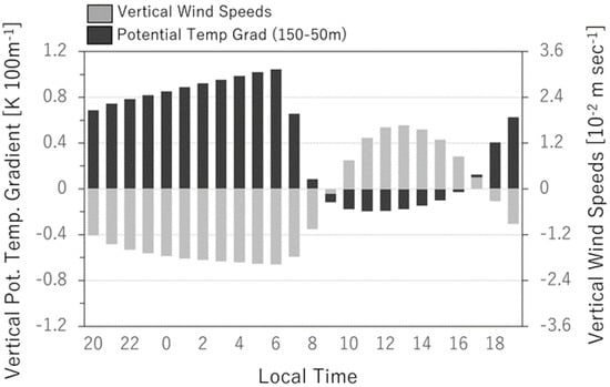 Area-averaged annual mean diurnal variation of the vertical potential temperature gradient (black bars) between 50 and 150 m above ground level and vertical velocity (grey bars) at 100 m above ground level.