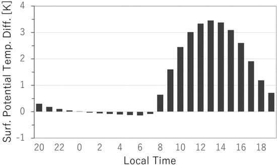 Due to the differences between heat capacities between land and sea, temperature differences are formed between them. This thermal contrast drives the land–sea breeze circulation which accompanies the changing directions of wind. The role of the land–sea breeze is also deduced through the magnitudes of hourly wind speeds. During the transition hours between land breeze and sea breeze, pressure difference between land and sea is reduced in response to the weakening of horizontal temperature gradients which then weakens the horizontal wind speeds. As the transitions occur during sunrise and sunset, signs of weakening horizontal wind speeds over the surface can be seen in Figure 3 during the 0800 and 1800 LT. After these transitions, a more pronounced horizontal pressure gradient between land and sea generates an increase in the horizontal wind speeds. This increase peaks around the early afternoon, signifying that the difference between land and sea surface temperatures are the highest. The largest difference in surface temperature between land and sea, which results as higher horizontal pressure gradients, happen during the day as seen in Figure 7, because of the heat capacity differences between land and sea that were discussed earlier. This explains why the magnitude of wind speeds is larger during the day than at night. However, because the coverage of the area used for the potential temperature differences in Figure 7 is vast and irregular, it will not perfectly represent the potential temperature gradient between land and sea. Nonetheless, it provides an idea of how significant the temperature differences are between night and day.