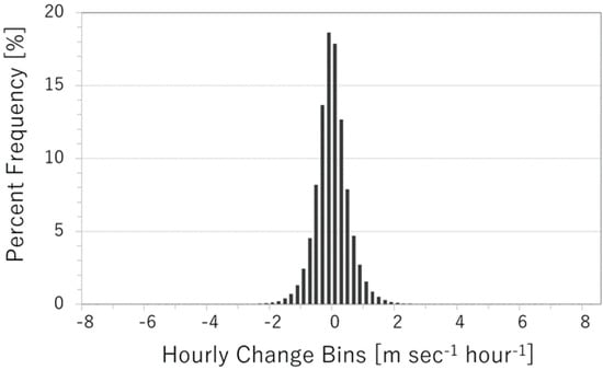Percent frequency of the hourly changes in one-year 100-m onshore wind speed for all the horizontal grid points.