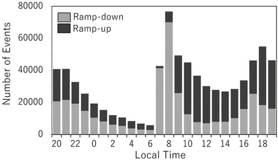 The annual number of occurrences of the 5% most extreme ramp-down events (grey bars) and ramp-up events (black bars) of wind speeds for each hour of a day.