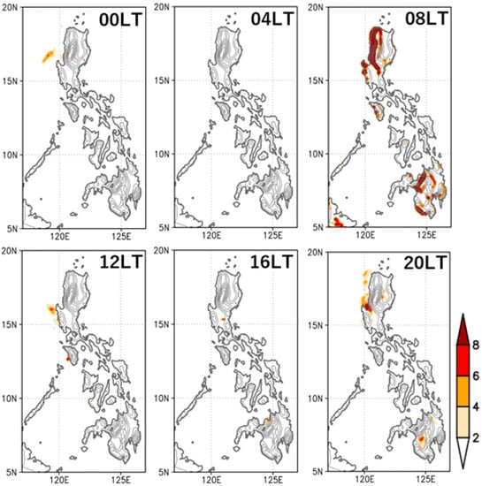 As the total fraction of wind energy generation continues to increase, extreme wind events, specifically its change, has become a growing concern for the efficient and secure operation of national power systems [,,]. For this reason, the spatial and temporal variability of extreme wind changes (ramp evets) all over the Philippine archipelago are analyzed in the study. The positive (negative) extreme change in the wind speeds is described as a “ramp up (ramp down)”. A histogram of hourly changes in wind speeds over all the grid points can be seen in Figure 8. To account for the maximum wind changes over the study region the upper and lower extreme events of hourly changes were analyzed. Using the 5th and 95th percentiles of wind speed changes or extreme wind changes in Figure 8 for ramp down and ramp up events, respectively, frequency in terms of the total number of events is binned depending on the local time at which they occurred (Figure 9). The occurrence of the extreme ramp-down events is commonly found at 0800 in the morning. This implies that, within a year, extreme decreases in wind speeds generally occur at that time given that the area-averaged annual means of hourly wind speed change also showed a decreasing trend at this hour. A similar trend is seen in the 1% and 0.1% percentiles of extreme wind speed changes (not shown). Having the same time of occurrence may mean that these extreme hourly changes in wind speed are caused by the same mechanisms described in previous section. Aside from the hourly occurrence of these ramp events, the spatial distribution of these extreme ramp events is also identified. Figure 10 shows the hourly spatial distribution of the 0.1% most extreme ramp-down events while Figure 11 shows the spatial distribution for the same percent extreme of ramp-up events. From the results, the extreme ramp events mostly happen over coastal regions and places with complex topography, further validating that these extremes occur due to the mechanisms discussed in the previous section. As complex topography appears to be only simulated within the islands of Luzon and Visayas, the extreme events only occur in those regions of the Philippines. Another reason will be geographical factors, such as coastal shape and size of the island, that modulate the timing and the magnitude of the extreme wind changes.